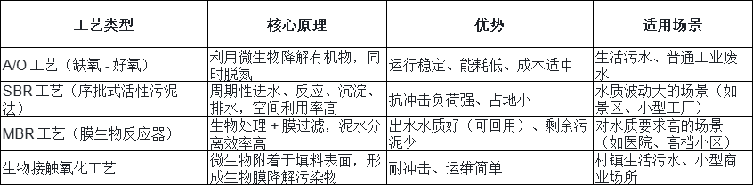 設(shè)備處理效率與穩(wěn)定性,核心取決于工藝選擇與材質(zhì)質(zhì)量。目前主流小型污水處理設(shè)備以 “生物處理” 為核心,結(jié)合預(yù)處理與深度處理單元,形成完整處理流程: