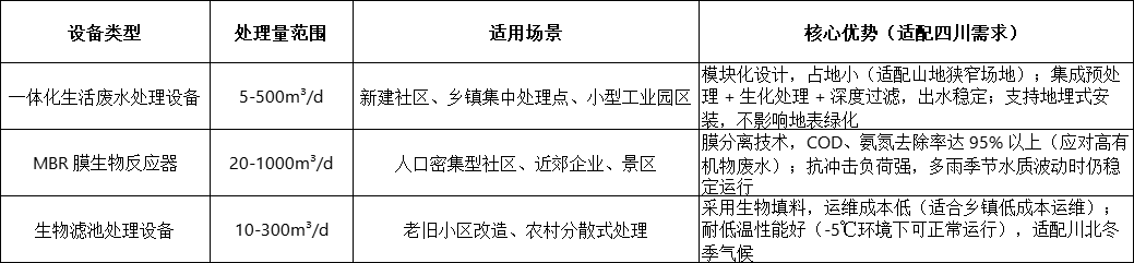 不同應(yīng)用場(chǎng)景(如新建社區(qū)、老舊小區(qū)改造、鄉(xiāng)鎮(zhèn)集中處理、小型企業(yè))對(duì)處理量、運(yùn)維難度的需求不同,四川市場(chǎng)主流設(shè)備可分為 3 類,其適用場(chǎng)景與核心優(yōu)勢(shì)如下: